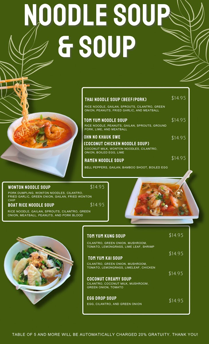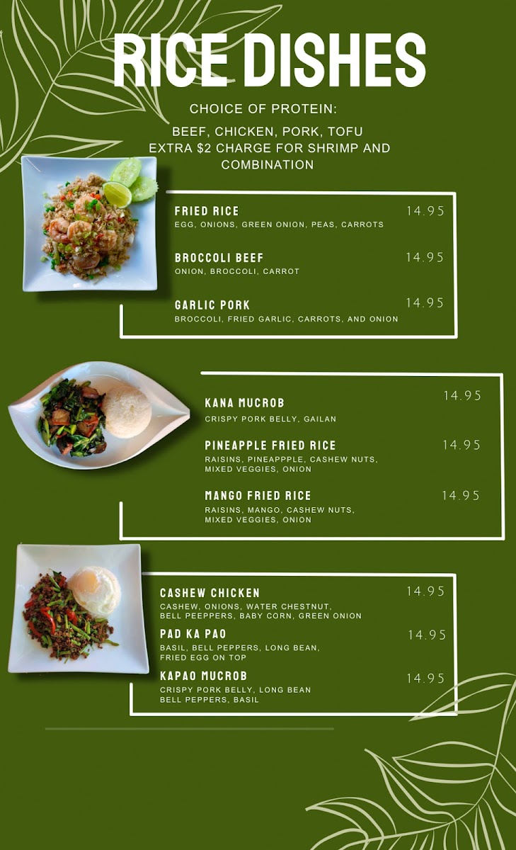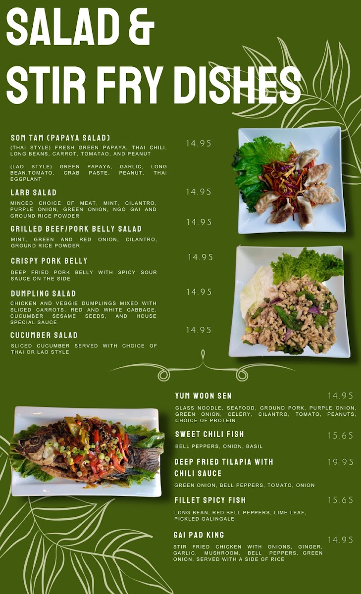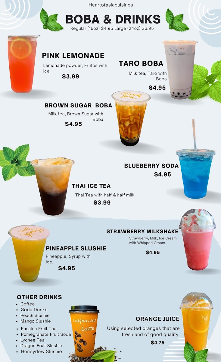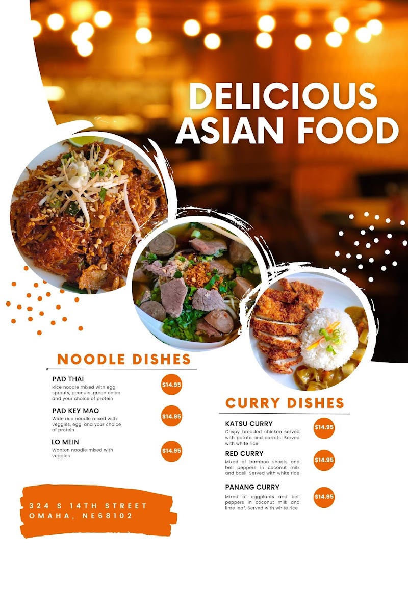 From a reviewer’s perspective, the menu at Heart Of Asia Cuisines in Downtown Omaha offers a satisfying variety that captures both comfort and bold Southeast Asian flavors at approachable prices. The fresh Cucumber Salad and flavorful Laab Salad make for a light start, while heartier options like Leng Saeb stand out as a unique specialty. The noodle section is particularly impressive, with favorites such as Pad Thai, Pad See Ew, and the rich Tom Yum Noodle Soup delivering depth and balance. Curry lovers will appreciate classics like Green Curry, Panang Curry, and Yellow Curry, each offering a comforting, aromatic experience. Rice dishes such as Pineapple Fried Rice and Kapao Mucrob provide satisfying portions, while stir-fry options like Crispy Pork Belly and Deep Fried Tilapia W/Chili Sauce add bold, savory variety. The menu is rounded out with refreshing drinks like Thai Tea and Thai Ice Coffee, alongside fun boba selections such as Milk Teas and Slushies. To finish, desserts like Mango Sticky Rice and Fried Ice Cream offer a sweet, memorable ending. Overall, the menu feels diverse, well-curated, and appealing to both adventurous diners and those seeking familiar favorites.
